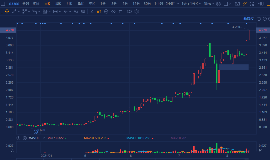 中国玻璃(3300.HK)继续走强,大幅拉升涨超10%,年内股价已暴涨7倍。现报4.28元创逾10年新高价,暂成交1.3亿港元,总市值近80亿港元。