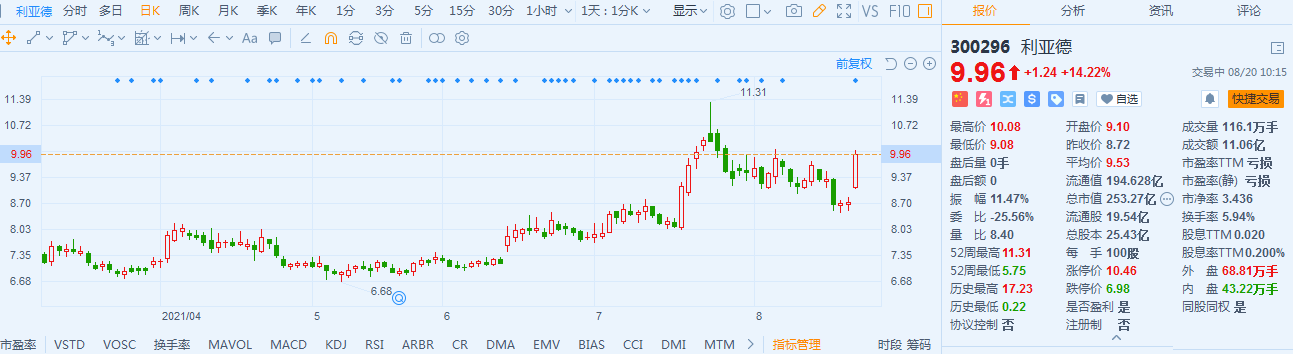 利亚德(300296.SZ)股价高开高走,现报9.96元,涨幅14.2%,最新总市值253.3亿,换手率6%。