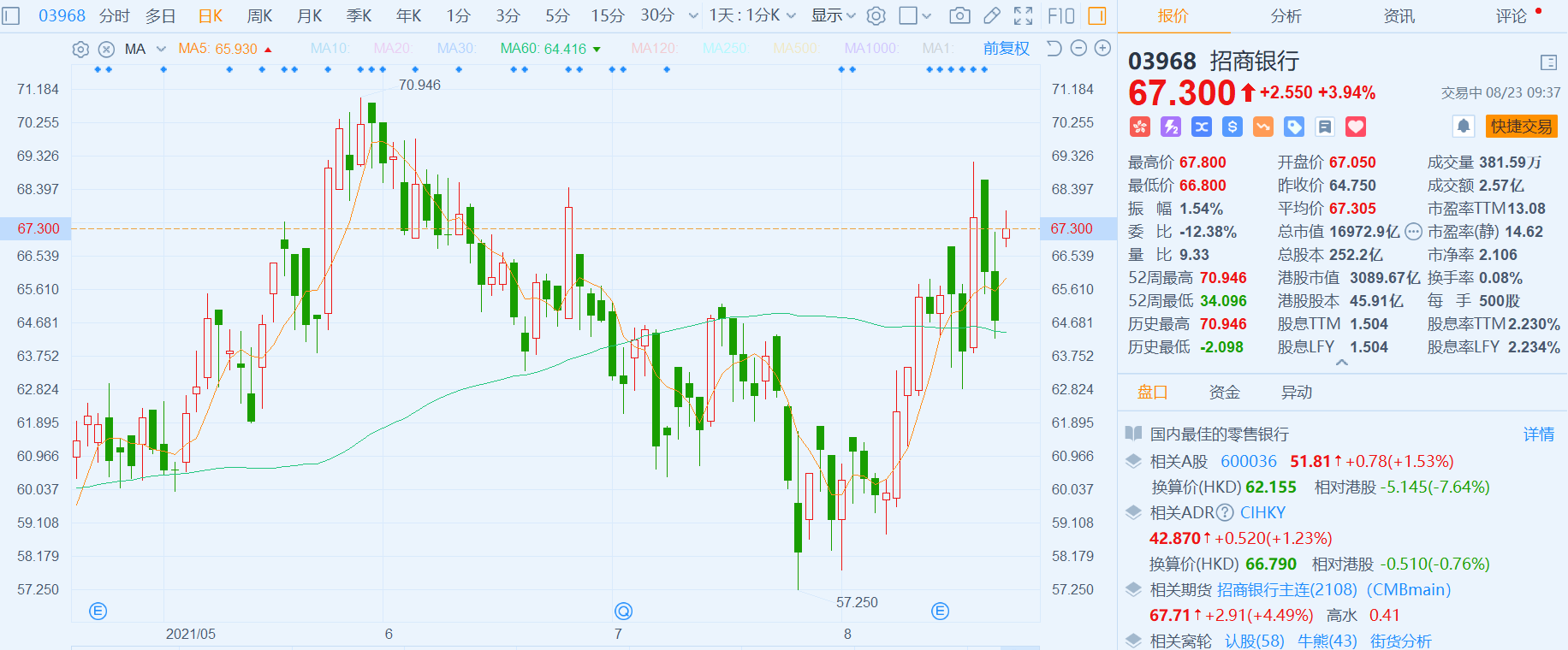 招商银行(3968.HK)涨约4%,报67.3港元; 招商银行(600036.SH)亦涨1.53%。