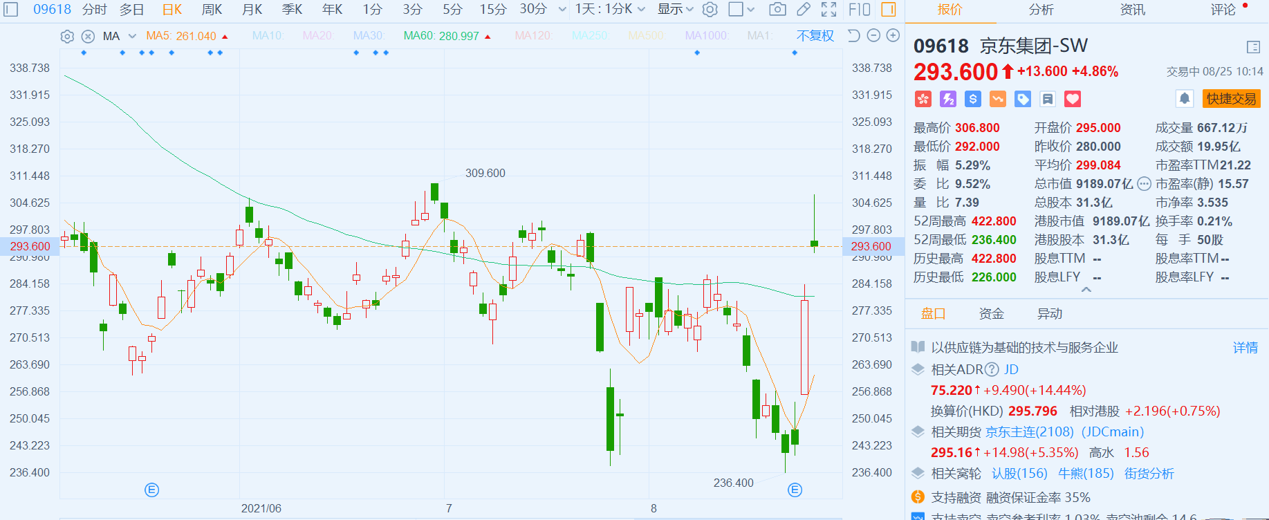 继昨天飙升近15%后,京东集团-SW(9618.HK)今天再度涨近5%,高见306.8港元创约三个月新高,最新总市值9189亿港元。