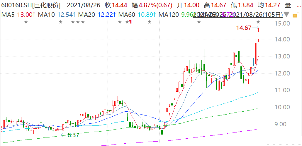 继昨日涨停后,巨化股份(600160.SH)今日盘初再度拉升涨超6%报14.67元,股价创逾5年新高,市值逼近400亿元。