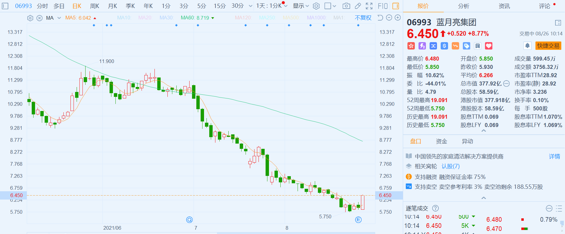 蓝月亮(6993.HK)大涨8.77%,报6.45港元,总市值378亿港元。