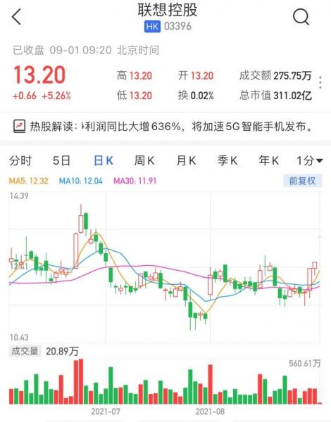 联想控股(3396.HK)高开5.26%,现报13.2港元,最新市值311亿港元。