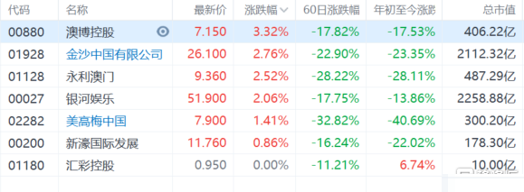 濠赌股继续走强,澳博控股(0880.HK)涨超3%,金沙中国、永利澳门、银河娱乐均涨超2%。