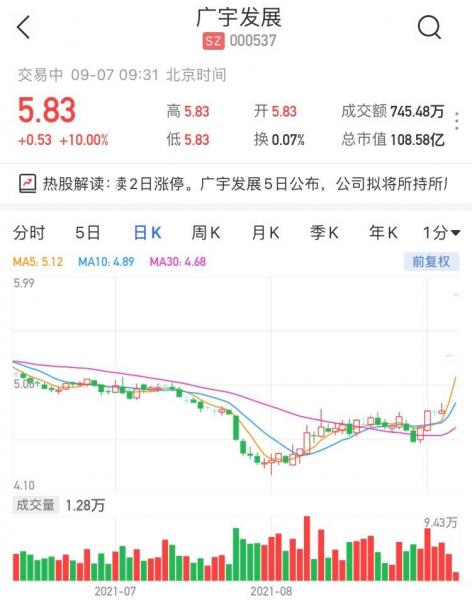 广宇发展(000537.SZ)连续两日涨停,现报5.83元,封单逾224万手,暂成交745万元,最新市值108亿元。