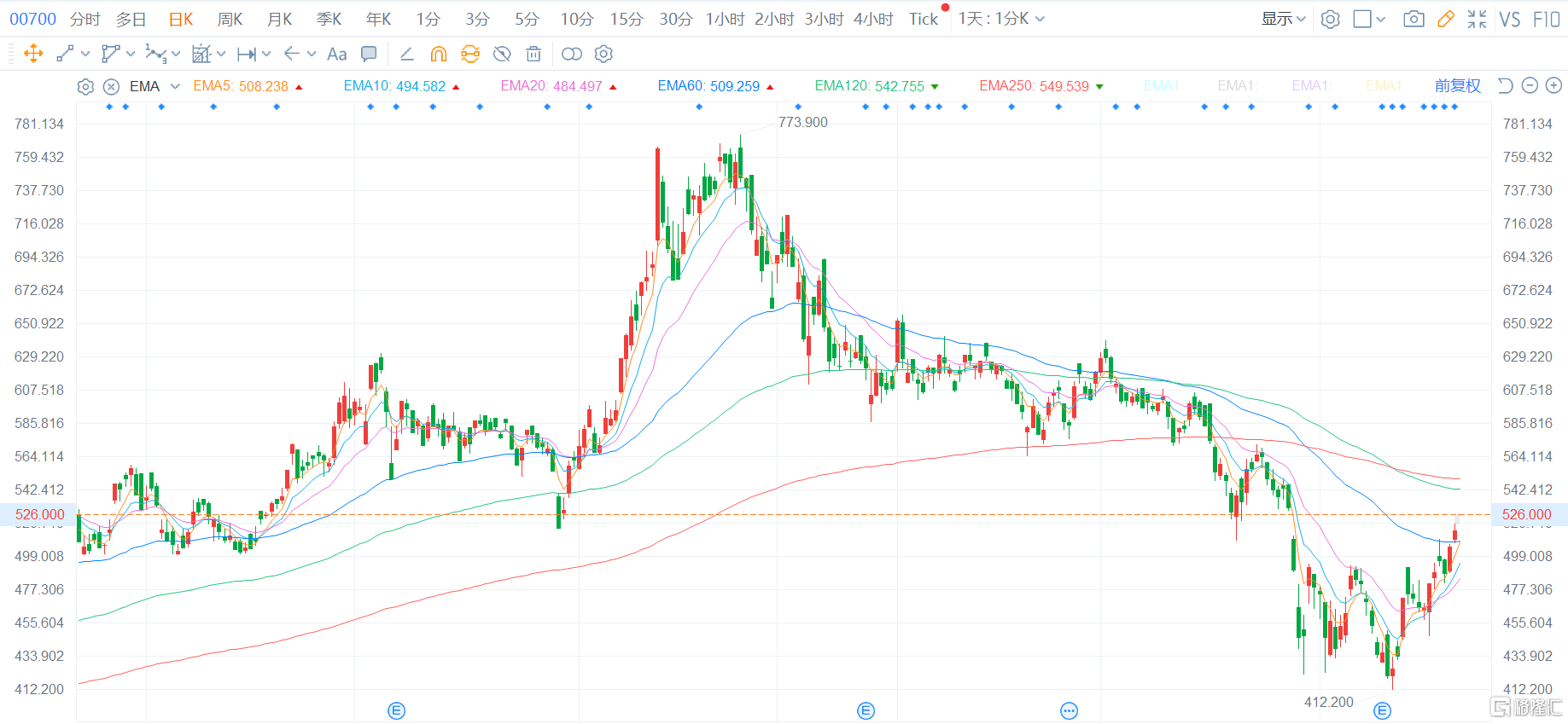 腾讯(0700.HK)今日继续走强,早盘高开2.04%报526港元,股价创7月23日以来新高,且较前期调整低点(8月20日盘中的最低价412.2港元)反弹27.6%,最新市值5.04万亿港元。
