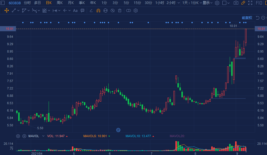 四通股份(603838.SH)盘初快速拉升至涨停板,报10.01元创一年新高价,总市值32亿元。