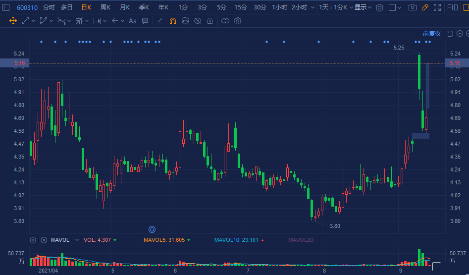 桂东电力(600310.SH)竞价一字涨停板,报5.16元,总市值53.48亿元。