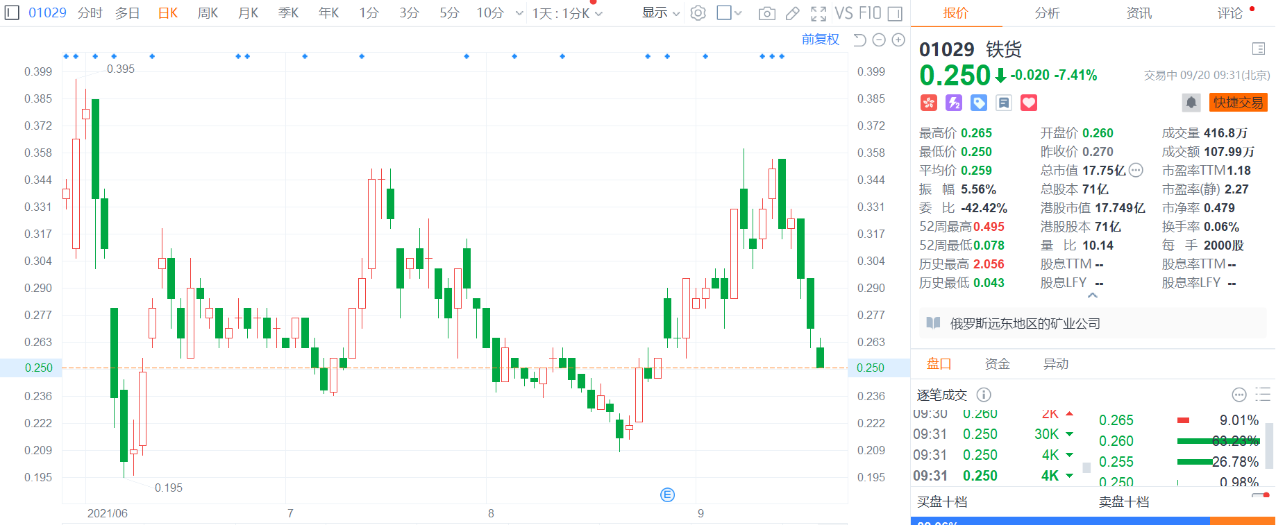 铁货(1029.HK)低开低走,现跌幅扩大至7.41%,报0.25港元,总市值18亿港元。