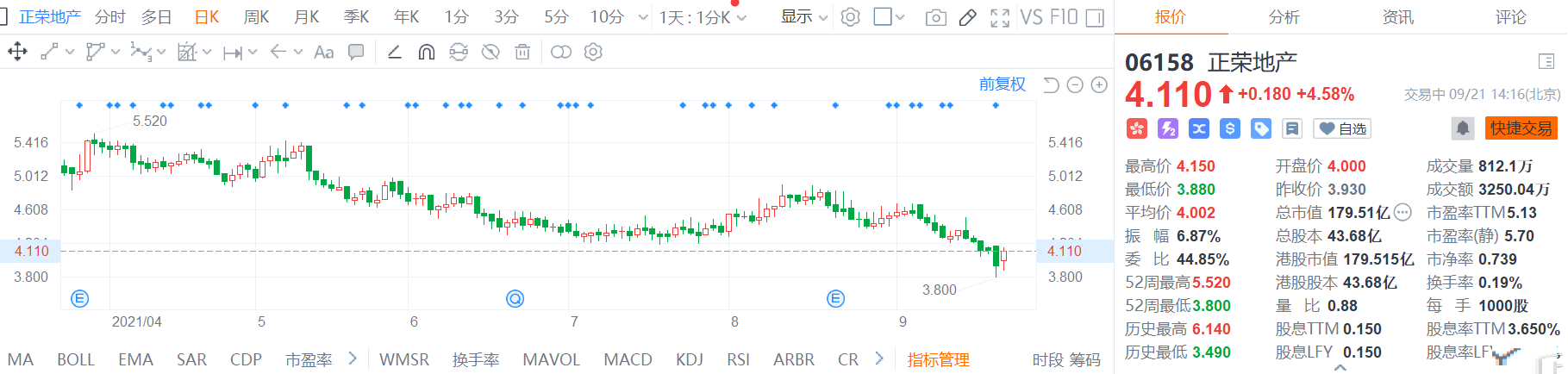 正荣地产(6158.HK)股价快速拉升,现报4.11港元,涨幅4.58%,最新总市值179.5亿港元。
