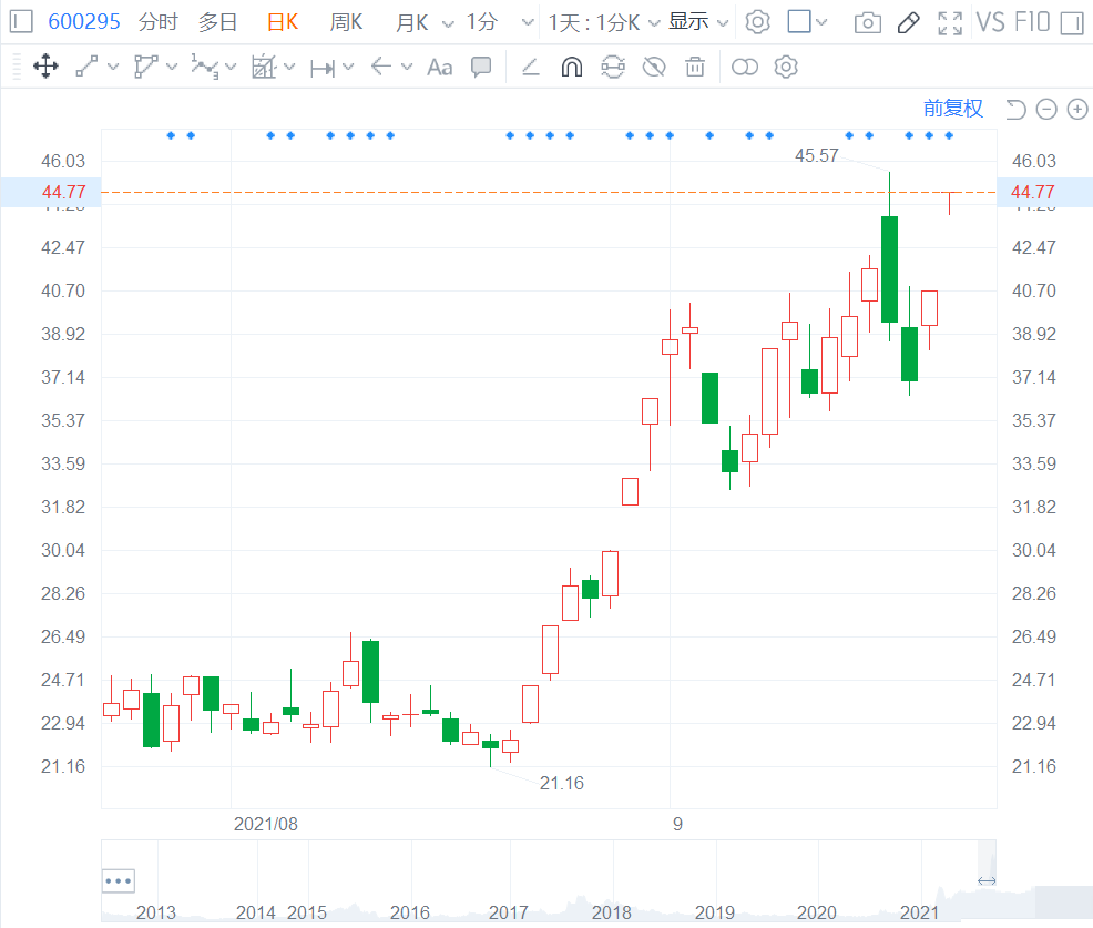 鄂尔多斯一度触及涨停,报44.77元,总市值639亿元。
