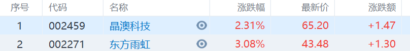 东方雨虹(002271.SZ)涨逾3%,报43.48元;晶澳科技(002459.SZ)则涨2.31%,报65.2元。