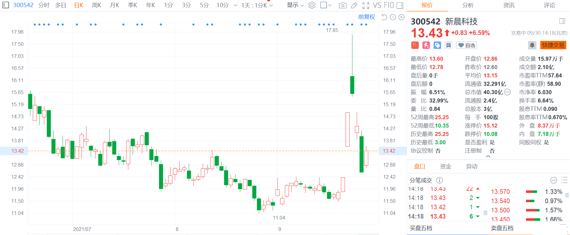 新晨科技(300542.SZ)今日高开高走,现涨幅扩大至6.59%,报13.43元,总市值40亿元。