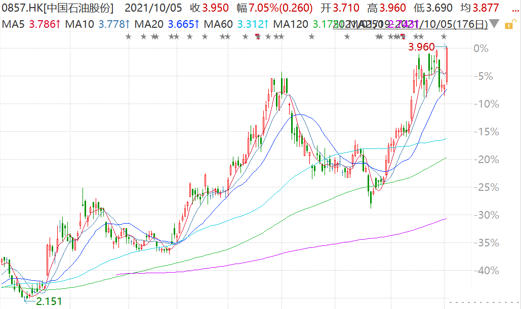 港股“三桶油”涨幅进一步扩大,其中,中国石油股份(0857.HK)涨超7%至3.96港元,股价创2019年5月以来新高;中国石油化工涨超3%,中国海洋石油涨近3%。隔夜美油一度涨至78.38美元,创2014年以来新高;布油一度涨至82美元,创2018年以来新高。