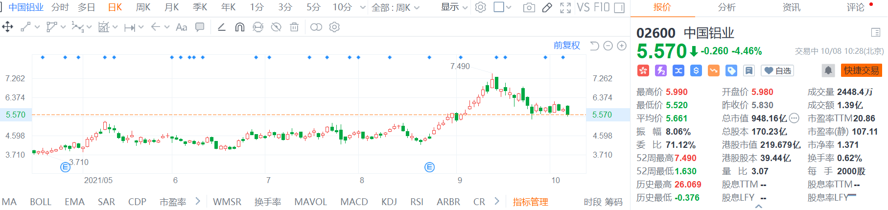 中国铝业(2600.HK)高开逾2%后快速走低,现报5.57港元,跌幅4.4%,总市值948.2亿港元。