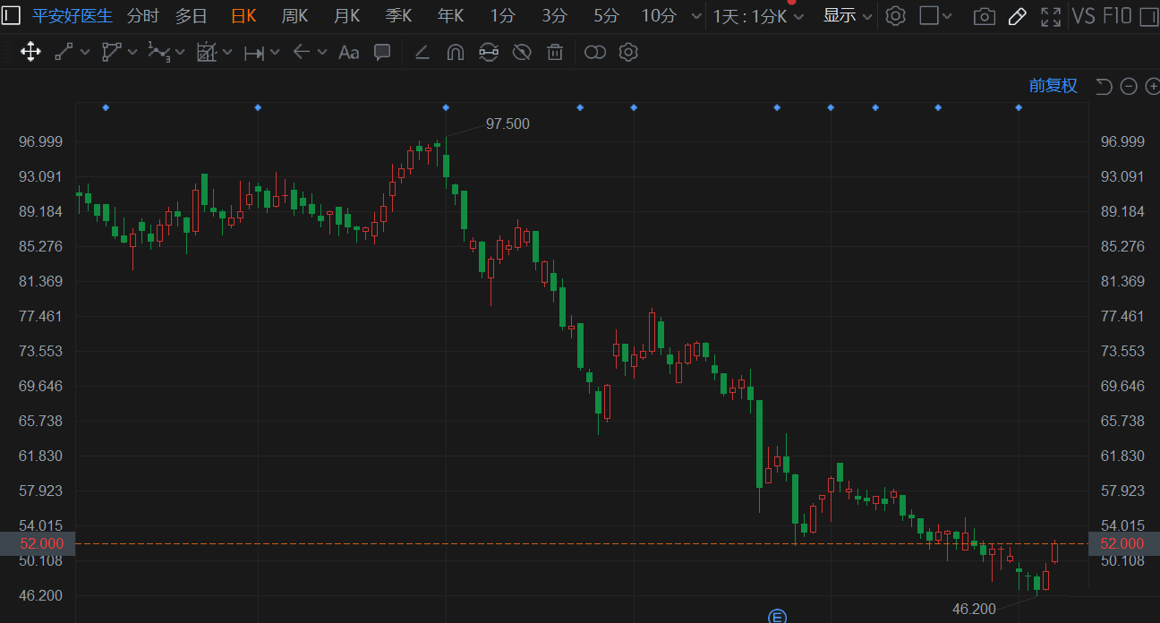 平安好医生(01833.HK)高开高走,现涨超6%,2日反弹超10%。现报52港元,总市值597亿港元。