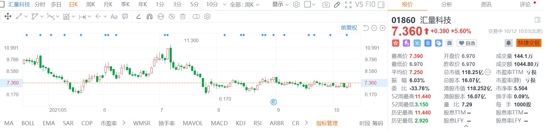 汇量科技(1860.HK)股价直线拉升,现报7.36港元,涨幅5.6%,最新总市值118.3亿港元。