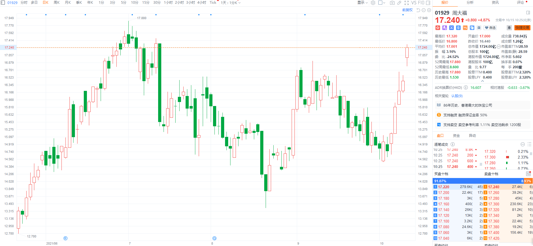 周大福(1929.HK)涨约5%,报17.24港元创近三个月新高,近五日累涨约17%,总市值1724亿港元。