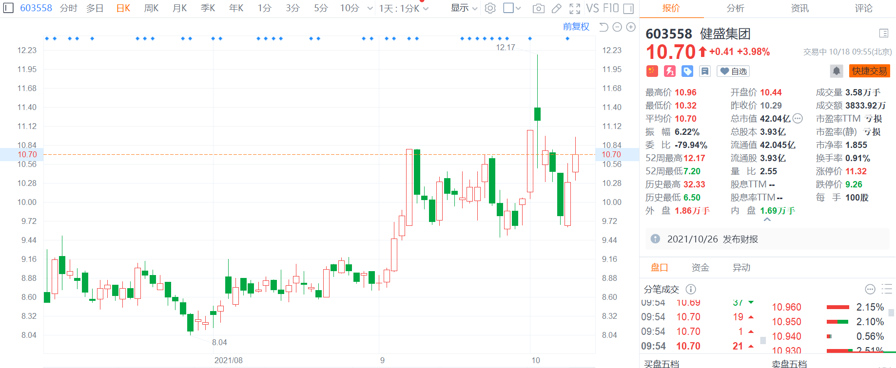 健盛集团(603558.SH)涨约4%,报10.7元,总市值42亿元。