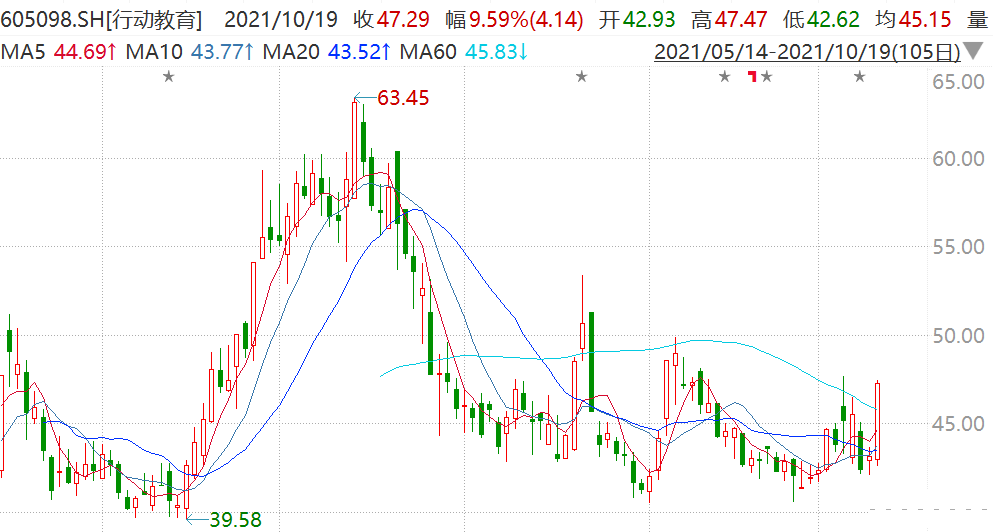 行动教育(605098.SH)午后进一步拉升一度触及涨停板,报价47.47元,市值40亿元。