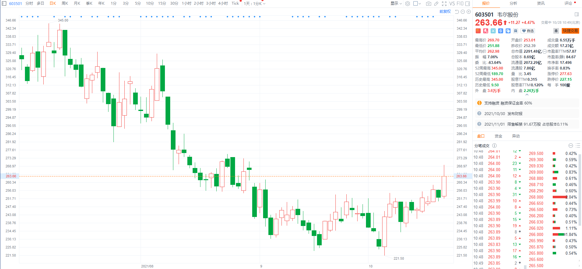 韦尔股份(603501.SH)逆势涨4.47%,报263.66元,总市值2291亿元。