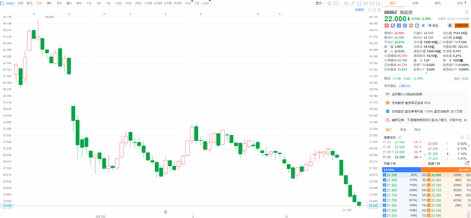 海底捞(6862.HK)跌2.44%,暂录七连跌,区间跌幅达28%,报22港元创近两年半新低,年内累计跌幅超62%,最新总市值1201亿港元。