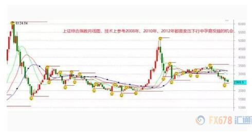 其二,以上海证券综合指数月线图为分析标的,可知当月线图中跌穿所有均线系统后,一旦有“政策底”的出现,演绎成市场波段反弹,均有波段性的机会出现,8年金融危机后,股票市场指数下跌12个月,在跌穿所有均线系统后孕育出一波反弹(基本面上是管理层启动了四万亿的投资)