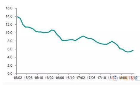 内需方面,社会消费品零售销售在2018年的三季度由此前2017年同期的10.2%下降至9.2%。主要原因是居民房贷的上涨挤压了消费增长。
