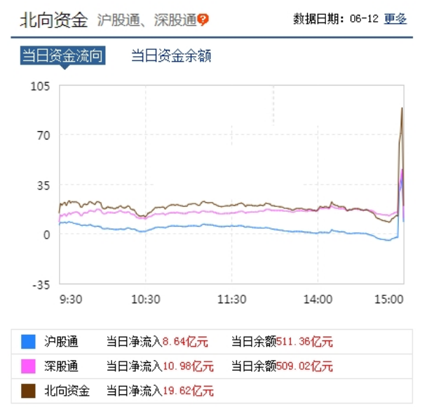 值得注意的是,在指数开盘深度下探之际,以“聪明资金”著称的北上资金,仍成为当天的强势买盘,悄悄进场,抢筹优质标的。6月12日,截止收盘,北向资金净流出8.94亿元:截至A股收盘,统计数据显示北向资金合计净流出8.94亿元。其中沪股通净流出7.31亿元,深股通净流出1.63亿元。北向资金尾盘异动,一度净流入近90亿元,最终收盘时净流入19.62亿元。