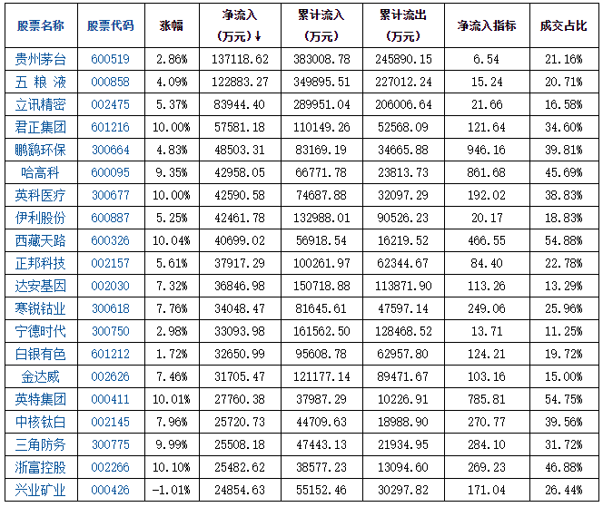 截止13:30:00,沪市累计净流入-27.86亿元,深市累计净流入64.25亿元,两市累计净流入36.39亿元,北向资金净流出超10亿元,其中沪股通当日净流出24.43亿元。