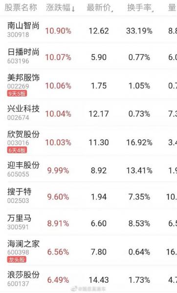 【#A股多只纺织服装股涨停#】#国是论坛# 25日早盘,A股日用化工、纺织服装板块领涨,日播时尚、美邦服饰、欣贺股份等涨停,华茂股份、七匹狼等大幅跟涨。截至发稿,南山智尚、日播时尚、美邦服饰、兴业科技、欣贺股份涨幅均超10%,其中,美邦服饰涨幅达10.06%。