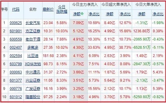 今日沪深两市主力资金净流入排名前5的个股分别为:长安汽车、方正证券、老白干酒、多氟多、比亚迪;主力资金净流出排名前5的个股分别为:京东方A、长春高新、TCL科技、三一重工、格力电器。
