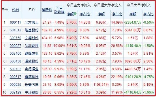 今日沪深两市主力资金净流入排名前5的个股分别为:北方稀土、隆基股份、宁德时代、深圳能源、赣锋锂业;主力资金净流出排名前5的个股分别为:美的集团、格力电器、中国平安、三一重工、*ST海航。