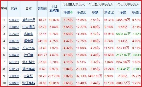 今日沪深两市主力资金净流入排名前5的个股分别为:盛和资源、中兴通讯、多氟多、酒鬼酒、长安汽车;主力资金净流出排名前5的个股分别为:隆基股份、中远海控、沃森生物、智飞生物、科大讯飞。