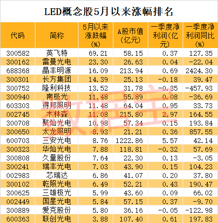 5月以来,9只LED股票累计涨幅超过10%,包括英飞特、雷曼光电、晶丰明源、长方集团、隆利科技等。从估值角度看,5股滚动市盈率不足20倍,分别是阳光照明、飞乐音响、晨丰科技、得邦照明、三雄极光。