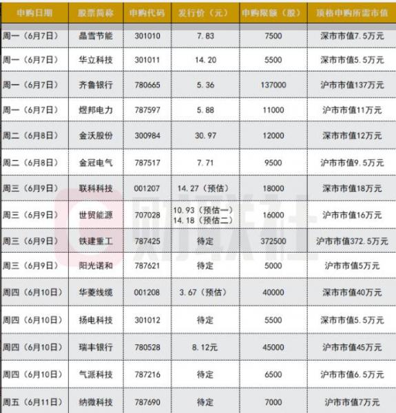 根据新股发行安排,下周(6月7日至6月11日)A股将有15只新股申购,包括主板5只、科创板6只、创业板4只。其中,创业板新股金沃股份具有“肉签”潜质,而科创板新股铁建重工与沪市主板新股齐鲁银行的中签率预计都比较高。