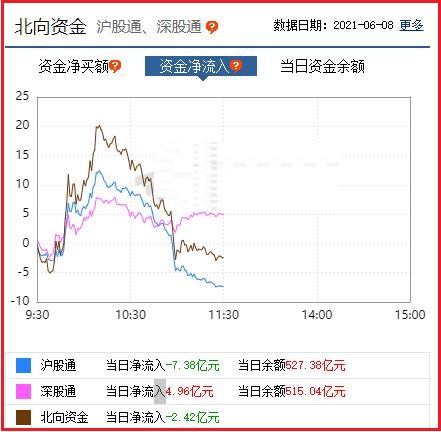 截至午间收盘: 北向资金净流出2.42亿元,其中沪股通资金净流出7.38亿元,深股通资金净流入4.96亿元。