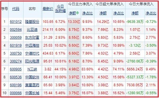 今日沪深两市主力资金净流入排名前5的个股分别为:隆基股份、比亚迪、东方财富、中远海控、宁德时代;主力资金净流出排名前5的个股分别为:京东方A、三一重工、舍得酒业、格力电器、万 科A。