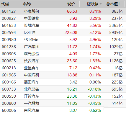 汽车整车板块午后回暖,小康股份涨超8%,比亚迪、长城汽车双双涨超5%,广汽集团、长安汽车跟涨。