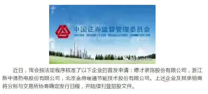 证监会核发3家企业IPO批文,分别为德才装饰股份有限公司,浙江新中港热电股份有限公司,北京金房暖通节能技术股份有限公司。上述企业及其承销商将分别与交易所协商确定发行日程,并陆续刊登招股文件。含科创板、创业板在内,本周共13家企业获得IPO批文。