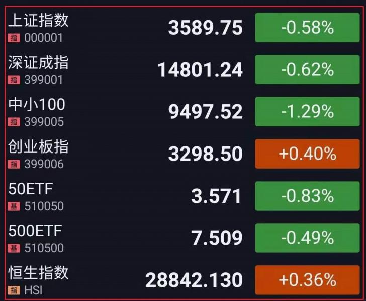 1.上周五A股三大指数集体高开。随后指数震荡下行,深成指一度跌逾1%,光刻胶、半导体、集成电路等芯片概念股全线回调,盐湖提锂、军工板块表现低迷;纺织制造、煤炭概念短线走高。盘中指数下探回升,鸿蒙概念持续发酵,碳中和主线回归,带动钢铁、电力板块回暖,浙江本地股、数字货币表现活跃;白酒、汽车、医美股下挫。午后,指数延续分化,消费电子、上海自贸区走弱,煤炭、有色板块升温。总体来看,市场情绪仍在缓慢修复中,两市逾2700个股下跌。截至收盘,上证指数跌0.58%,报3589.75点,深证成指跌0.62%,报14801.24点,创业板指涨0.40%,报3298.50点;