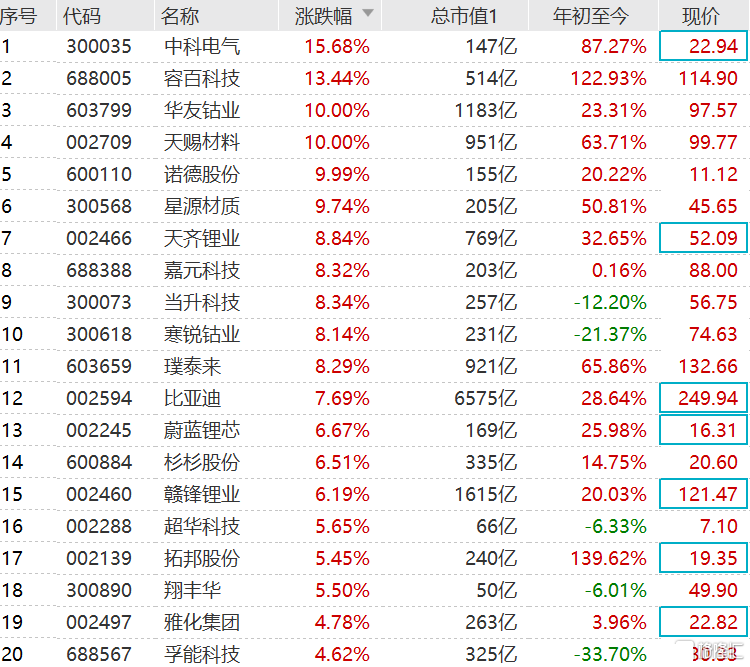 中科电气和容百科技涨超10%,天赐材料午后拉升封涨停板,诺德股份、华友钴业逼近涨停,星源材质涨超9%,璞泰来、嘉元科技、天齐锂业涨超8%,当升科技、比亚迪涨超7%,杉杉股份涨超5%,新宙邦等跟涨。消息面上,星源材质拟100亿元建设年产30亿平方米湿法隔膜和涂覆隔膜项目;天赐材料昨晚披露了一系列扩产项目,其中包括将投资10.5亿进行15万吨六氟磷酸锂和2000吨二氟磷酸锂的产能建设。
