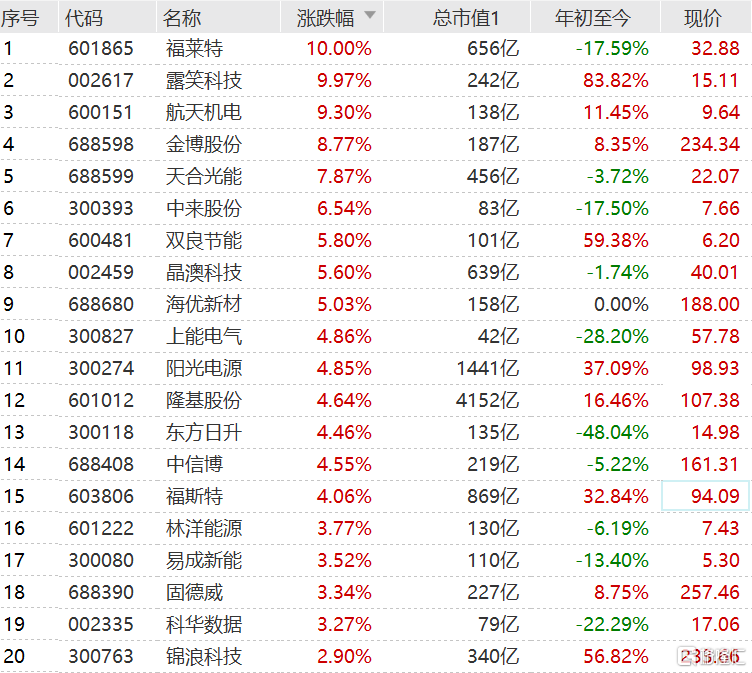 光伏股在经过周三的大幅回调会后,今日明显反弹,且为连续第二日反弹。成分股中,继露笑科技上午涨停后,福莱特午后拉升封涨停板,隆基股份、阳光电源和福斯特涨超4%,晶澳科技涨超5%,通威股份涨超2%。据资深行业人士称,今年以来光伏产业受上游原材料价格上涨影响较大,但近两日原材料价格已经开始回落,电池片出厂价格下调,因此利好光伏产业链相关公司。