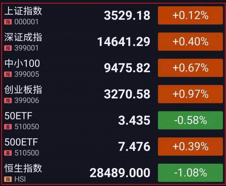 1.A股三大指数全线低开。随后指数先后翻红,钢铁、军工板块集体走强,鸿蒙概念延续强势;煤炭、机场航运、水泥等表现低迷。盘中指数冲高回落,电力、汽车股短线走高,国产软件、有色加工表现活跃,医美概念回暖;职业教育、旅游、免税店概念走弱。午后指数震荡盘整,纺织制造、新冠检测、第三代半导体异动拉升;养殖板块持续重挫。总体来看,市场呈现分化态势,两市逾2700个股上涨,权重股集体回调拖累指数。截至收盘,上证指数涨0.12%,报3529.18点,深证成指涨0.40%,报14641.29点,创业板指涨0.97%,报3270.58点;