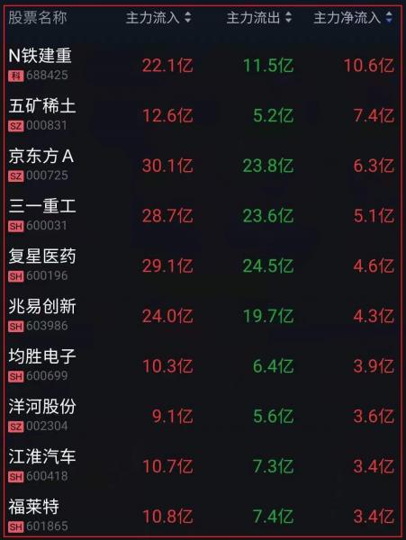 资金净流入十大人气热股: