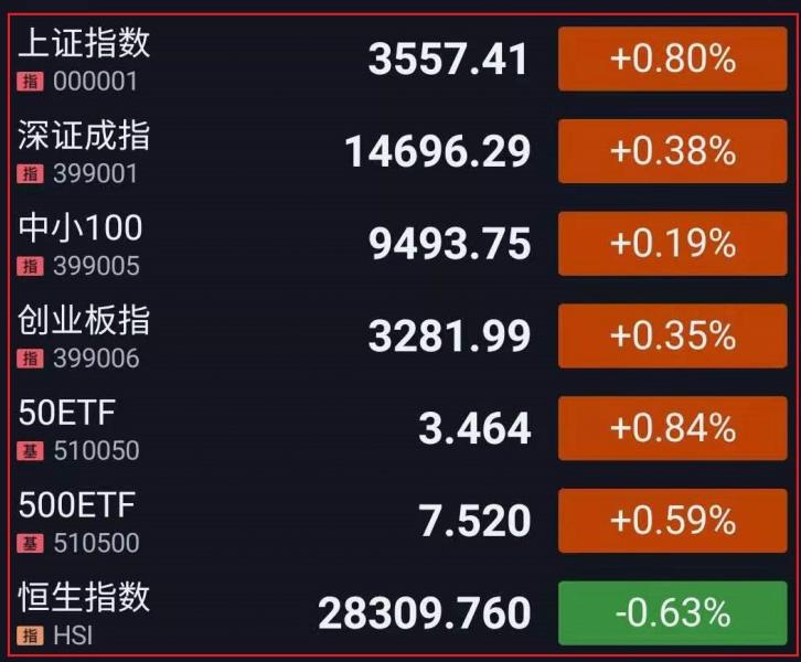 1.A股三大指数集体高开。随后深成指、创指悉数翻绿,光刻胶、集成电路等芯片概念股回调,钢铁、盐湖提锂表现低迷;油服概念股集体爆发。盘中指数走势分化,医美、银行股短线走高,农业股表现活跃;国产软件、网络安全概念下挫走弱。午后指数震荡盘整,稀土、汽车、煤炭概念走强,军工股回暖,电力、环保工程、碳中和行情回归;鸿蒙概念、数字货币大幅跳水。总体来看,市场情绪仍在缓慢修复中,两市逾2400个股上涨。截至收盘,上证指数涨0.80%,报3557.41点,深证成指涨0.38%,报14696.29点,创业板指涨0.35%,报3281.99点;