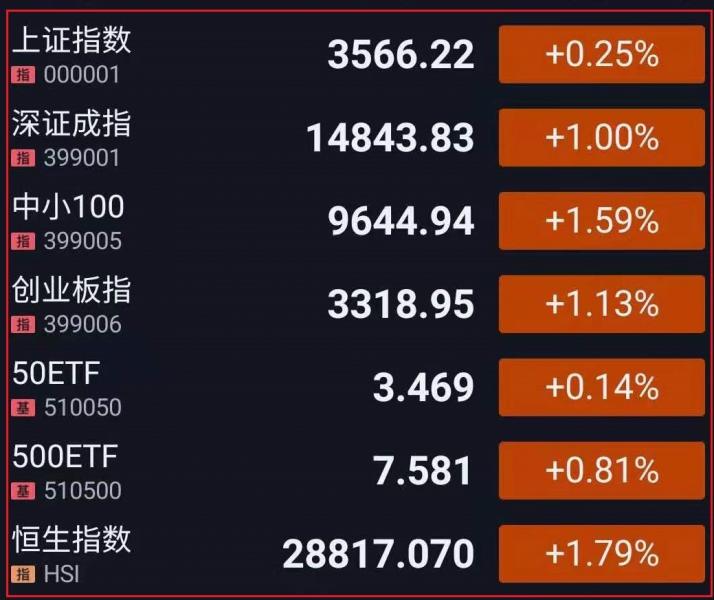1.A股三大指数集体高开。随后下探回升,创指重回3300点,半导体及元件、光刻胶、集成电路等芯片概念股行情修复;采掘服务、可燃冰、页岩气继昨日大涨后迎来回调,白酒股表现低迷。盘中指数震荡上行,盐湖提锂领涨,汽车股强势爆发,光伏、港口航运、在线旅游表现活跃;食品加工制造、转基因概念走弱。午后指数高位盘整,消费电子、无线耳机、智能音箱概念股全线爆发,煤炭、鸿蒙概念短线拉升。截至收盘,上证指数涨0.25%,报3566.22点,深证成指涨1.00%,报14843.83点,创业板指涨1.13%,报3318.95点;