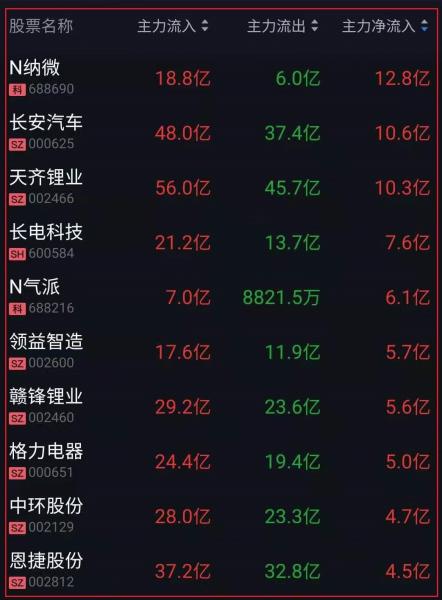 资金净流入十大人气热股: