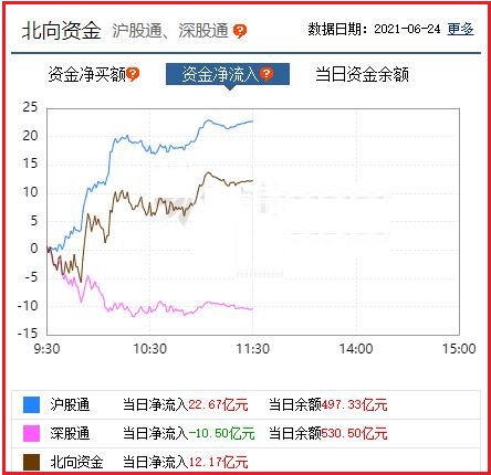 截至午间收盘: 北向资金净流入12.17亿元,其中沪股通资金净流入22.67亿元,深股通资金净流出10.50亿元。