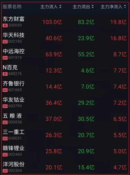 资金净流入十大人气热股: